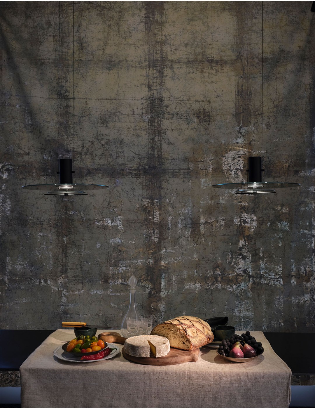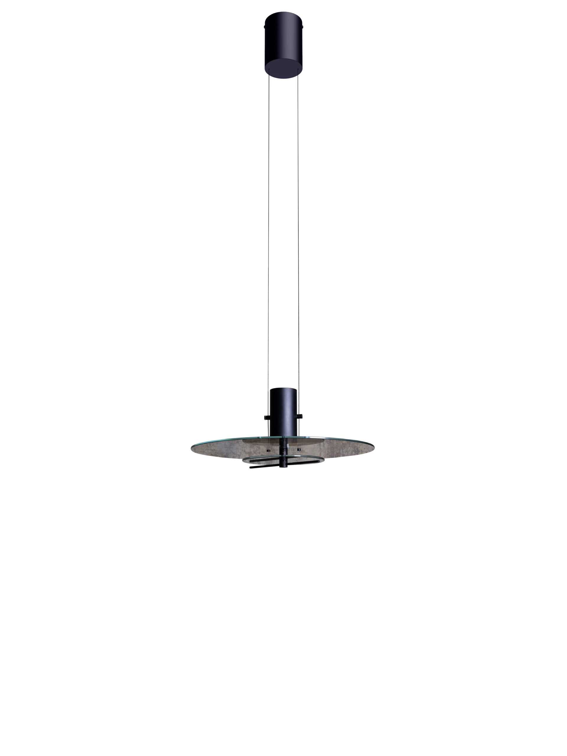 Hanglamp bestaande uit twee glazen schijven die door een speels en verrassend proces zacht licht doorlaten. Met behulp van een draaiknop is het mogelijk om de tint van de bovenste schijf te variëren, van transparant tot volledig ondoorzichtig, waardoor er naar wens meer of minder licht doorheen kan.