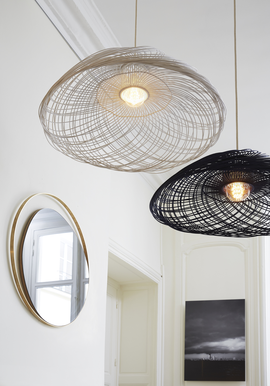 Ontwerper Elise Fouin heeft een originele witte ophanging gemaakt van rotandraden, uitgegeven door uitgeverij Forestier.