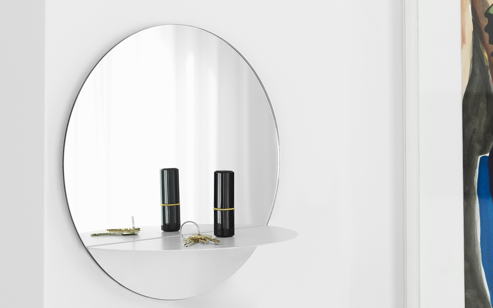 De reflectie in de spiegel geeft diepte aan de horizon van de stalen plank, terwijl de op de plank geplaatste items in de reflectie worden gedupliceerd. Met een zeer eenvoudige opzet ontstaat er een prettig en fascinerend gevoel van ruimtelijkheid.