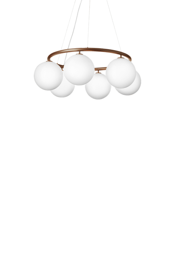 Miira 6 Circular is een moderne kroonluchter met een Scandinavisch en minimalistisch design. Een gladde halo metalen ring is netjes gepoedercoat in een gouden messing afwerking en bevat 6 grote mondgeblazen glazen bollen in opaalwit glas, waardoor een zacht en diffuus licht naar de directe omgeving wordt verspreid. De kleine kroonluchter is geschikt als centrale verlichting in een kleinere woonkamer of als twee kroonluchters boven een langwerpige eettafel, waarbij het strakke design Miira 6 Circular tot een sfeervolle maar praktische verlichtingskeuze maakt. Inclusief plafondplaat.