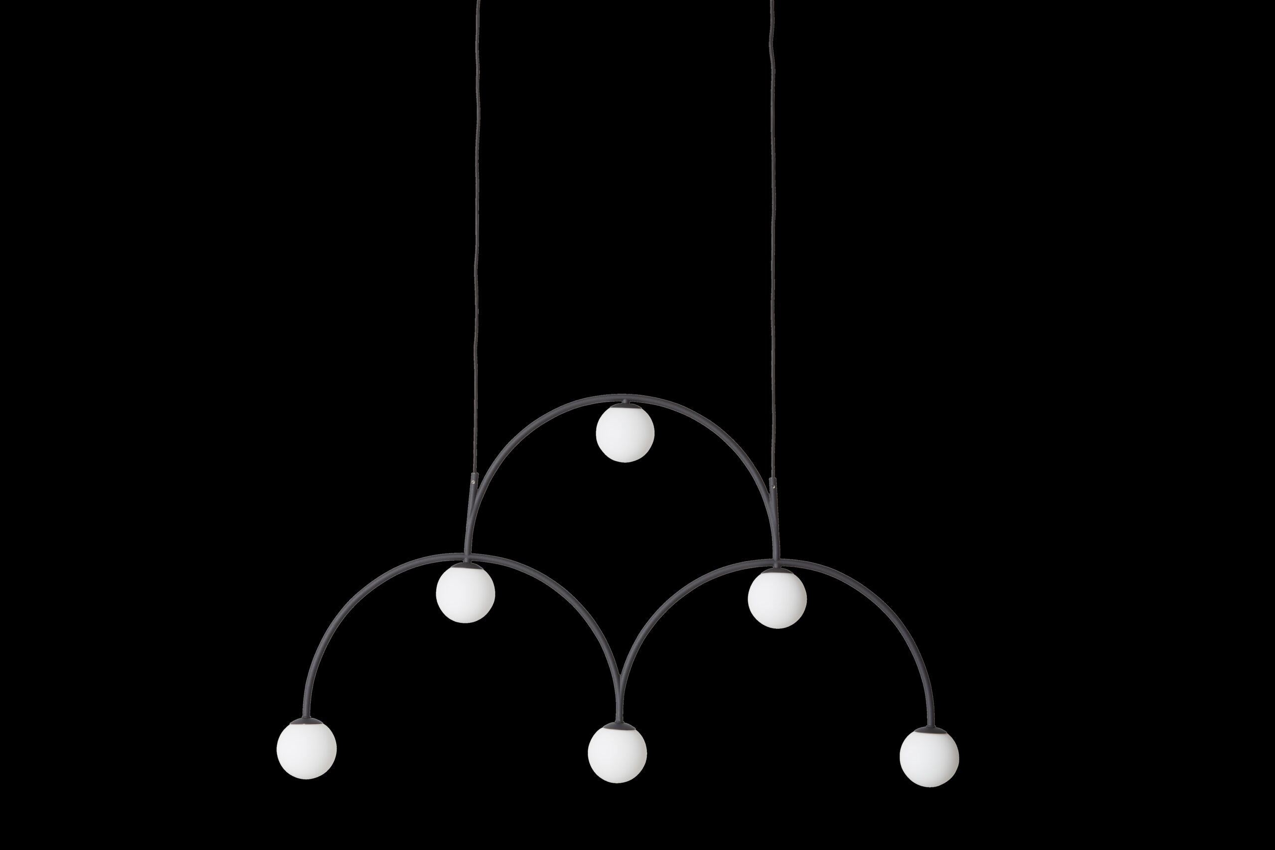 Bounce 116 Hanglamp vangt en verleidt het oog met zijn romantische bogen die beelden oproepen van machtige middeleeuwse kathedralen zonder afbreuk te doen aan lichtheid en elegantie. De vorm is geïnspireerd op het pad van de elektrische stroom van boven naar beneden. Kijk uit naar gezellige momenten in de zachte gloed van het mooie opalen glas van de Bounce boven de eettafel.