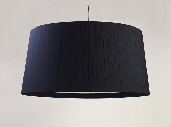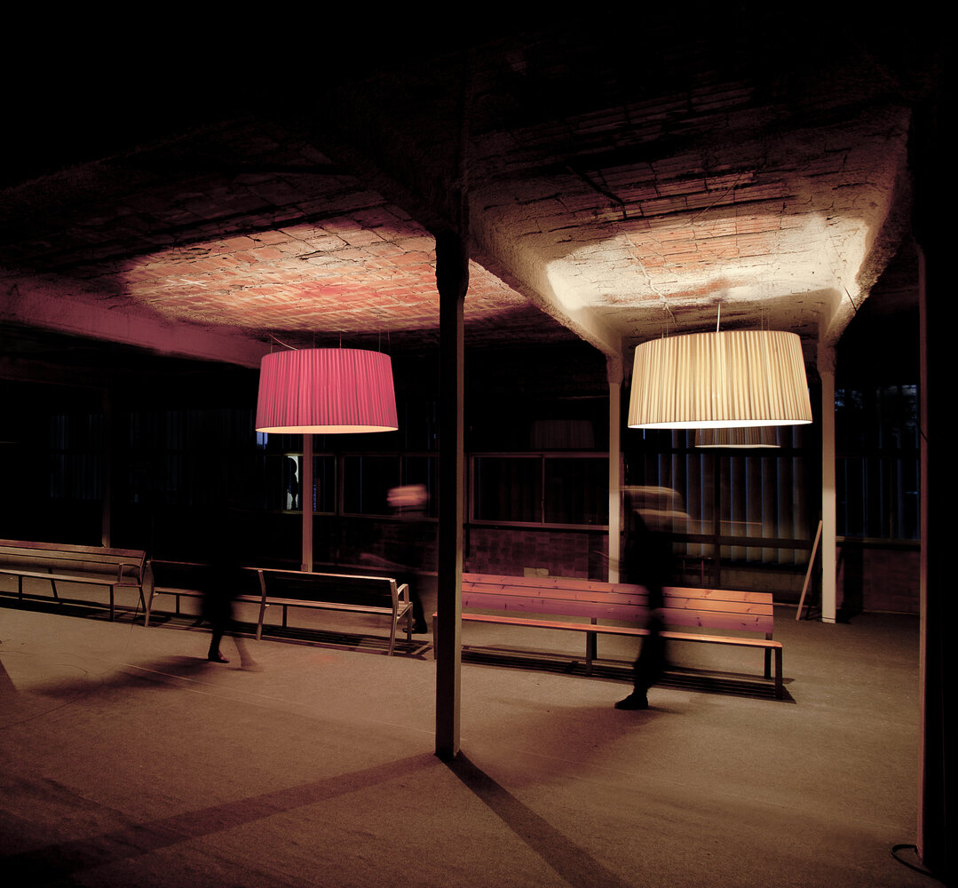 Twee lampen met volumineuze kapjes met linten, ontworpen voor grootschalige projecten. Beide zijn voorzien van een grote, doorschijnende schijf waarachter een krachtige LED-lichtbron schuilgaat. Santa & Cole pleit voor het gebruik van lampenkappen met linten om elke soort lichtbron aan te kleden, waarbij verschillende materialen worden onderzocht en met kleuren en tinten wordt gespeeld.