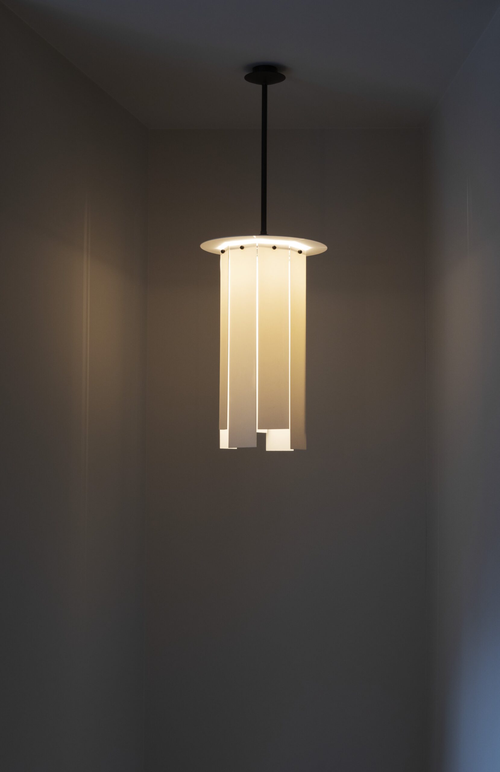 Licht en schaduw spelen een intrigerend spel wanneer de ronde Gilda lamp wordt aangestoken. De brede porseleinlinten variëren in lengte.