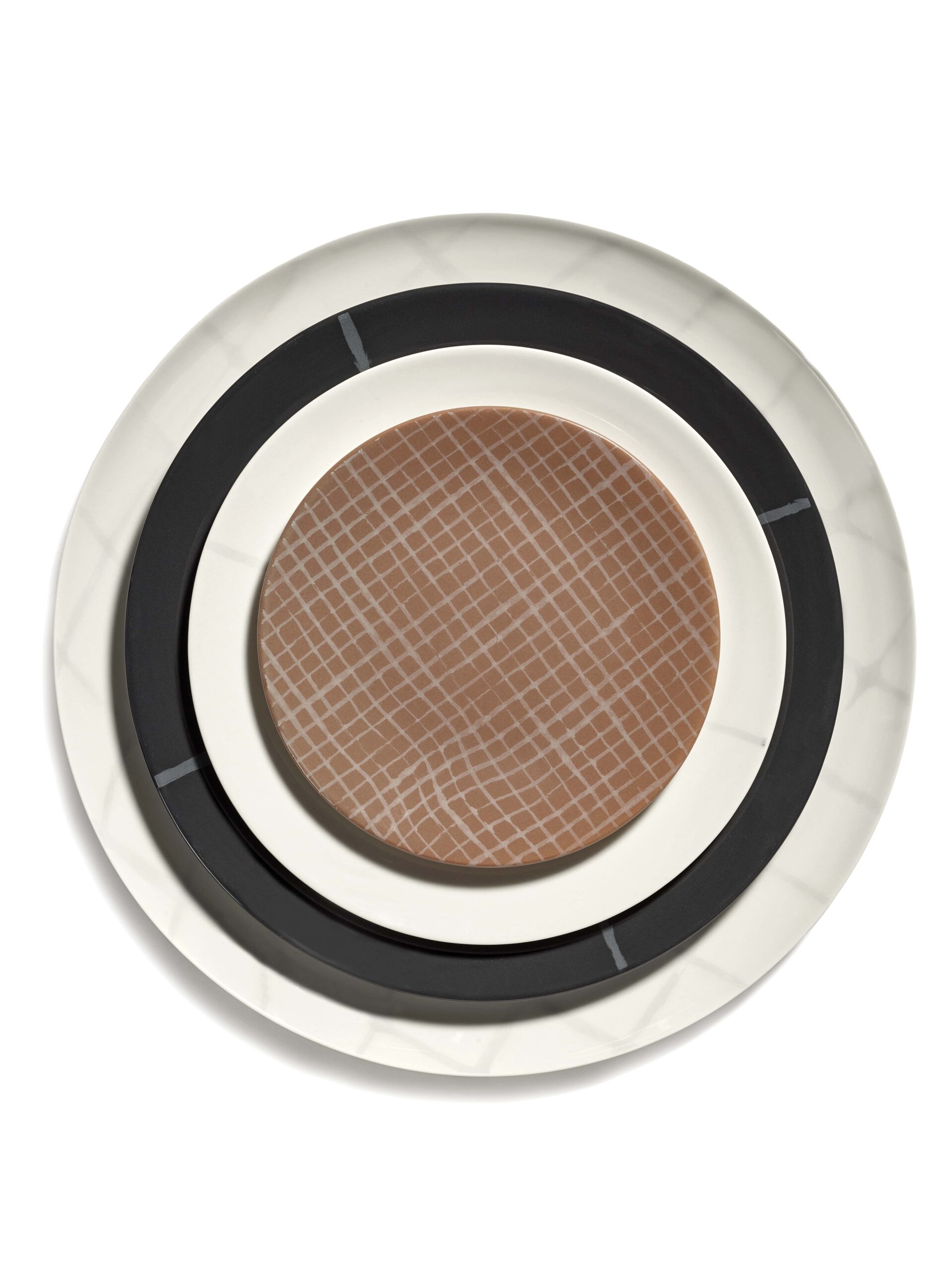 Voor het porseleinen Zuma servies is Kelly Wearstler vertrokken van een digitaal grafisch patroon geïnspireerd op Bauhausprincipes. Elk patroon wordt met een stempel aangebracht om een handgeschilderd gevoel over te brengen. Daarna pas wordt het glazuur aangebracht. De patronen variëren door het hele assortiment en de verschillende vormen en kleuren – wit, donkergrijs en accentkleur zacht oranje – laten zich gemakkelijk combineren.