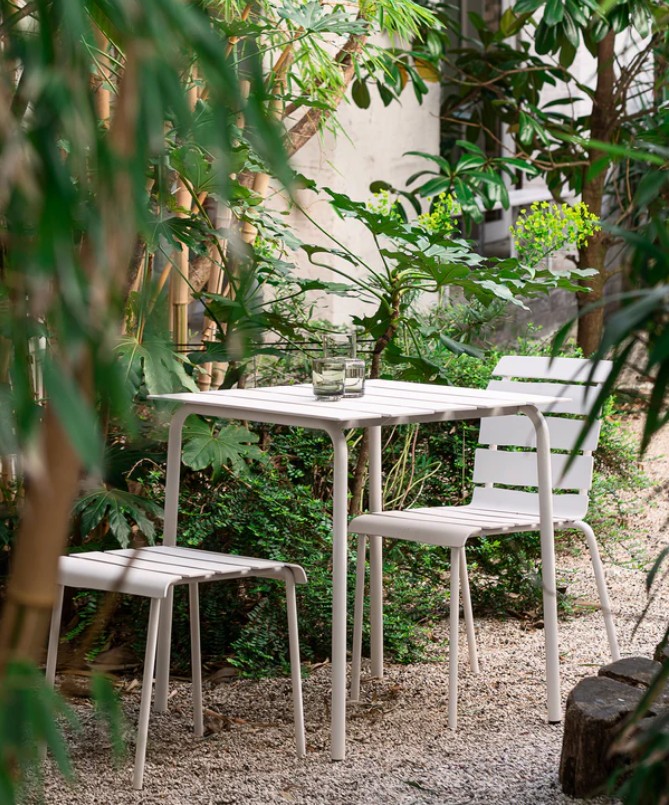 Een tuin verdient een ontwerp dat de schoonheid van de bomen, het gras en de bloemen intensiveert. Met dat in gedachten presenteren wij de alu tafel van het gerenommeerde designkoppel Muller Van Severen. De tafel is verkrijgbaar in drie maten, S, M en L en kan worden beschouwd als een creatieve voortzetting van de alu stoel. Net als de stoel bestaat de alu tafel uit een licht aluminium frame en een dik gelakt oppervlak, waardoor de kleurlaag een materiaal op zichzelf wordt. De kleuren zijn honderd procent Muller Van Severen, met specifieke en goed gekozen tinten roze, groen, geel en ecru. Deze frisse kleuren passen bij die van de stoelen en passen perfect bij het serene gevoel van het zonnige buitenleven. Het is de bedoeling van Muller Van Severen om de tafel zowel binnen als buiten te gebruiken. Door het lichte gewicht is hij gemakkelijk te verplaatsen.