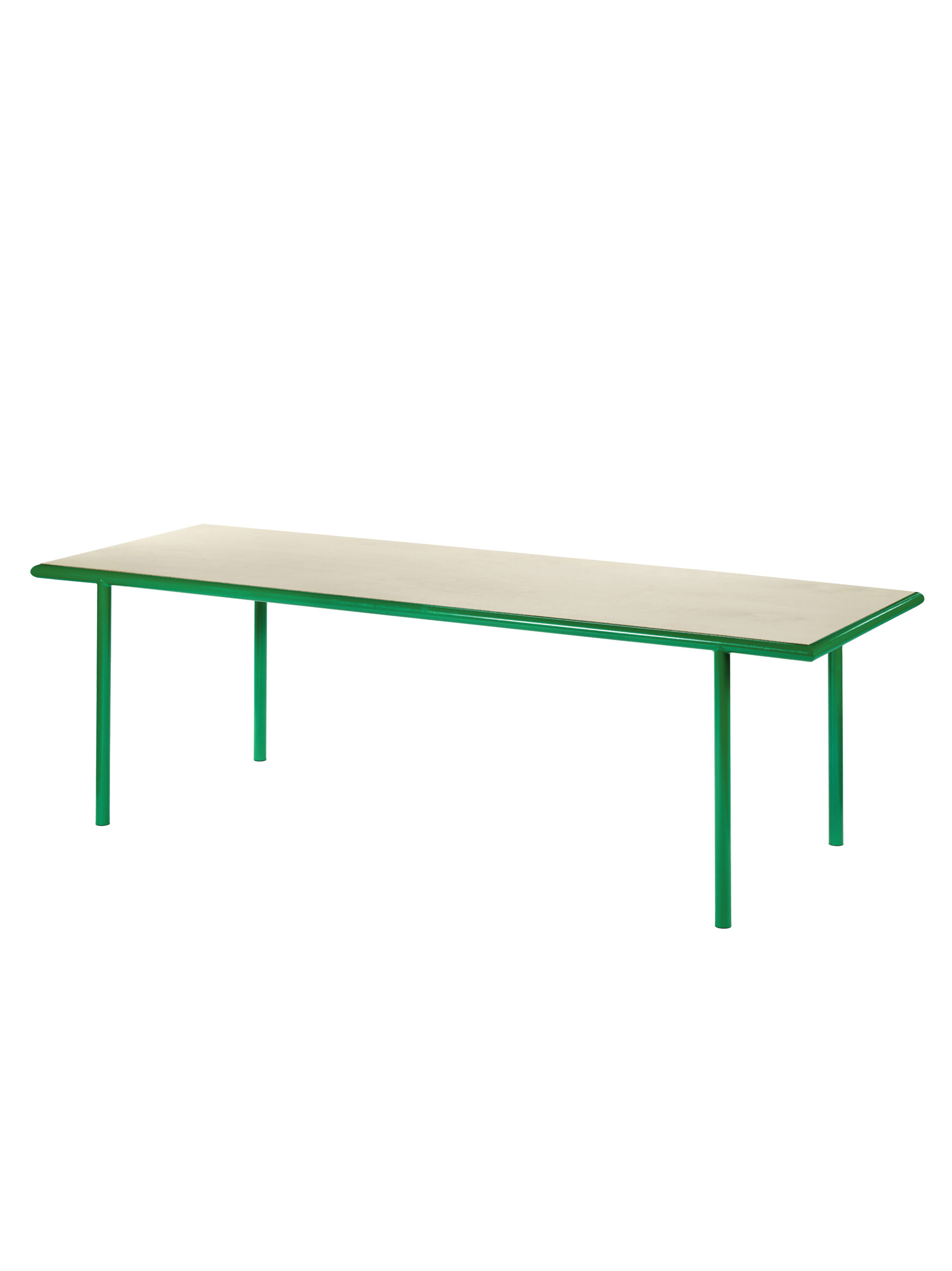 Voor de vijfde verjaardag van valerie_objects verrast Muller Van Severen de wereld met een creatie waarvan we dachten dat die nooit hun atelier zou verlaten: een houten meubel. Het is geen geheim dat Fien Muller en Hannes Van Severen hout altijd aan de kant hebben gezet om andere, minder gebruikelijke materialen de glans te laten stelen, zoals polyethyleen, email en lak. De nieuwe items zijn een knipoog naar de reftertafels uit de jaren negentig die nog steeds in scholen te zien zijn. Het frame en de poten van de tafel bestaan uit afgeronde stalen buizen. Het houten blad is verkrijgbaar in vier verschillende houtsoorten: een lichte berk, een klassieke eik, een stijlvolle walnoot en een donkerder kersenhout. Er zijn drie verschillende vormen beschikbaar: een eenvoudige ronde, een refectorisch-rechthoekige en een rechte versie met afgeronde hoeken.