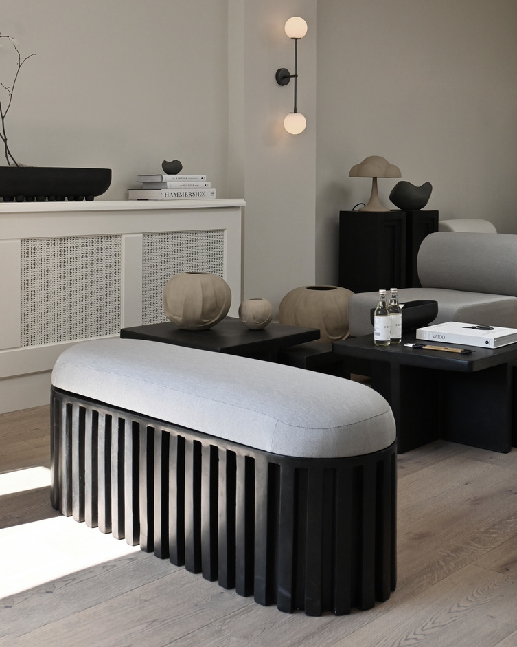 “Geïnspireerd door oude tribale sculpturen, is de Tribu-collectie gemaakt van een vezelbetonbasis met daarop een zacht gestoffeerd kussen. Gekenmerkt door een oppervlak van architectonische betonlamellen benadrukt Tribu de fijne balans tussen scherpe architectonische lijnen en een wat zachtere ronding van de gestoffeerde zitting. Combineer meerdere Tribu Lounge Chairs om een loungezitbank te creëren. Elke Tribu Lounge Chair wordt geleverd met twee montagebeugels, die onder elke poot kunnen worden gemonteerd en eenvoudig met een schroef kunnen worden vastgedraaid. Elk product wordt aangevuld met een zacht kussen, zorgvuldig gestoffeerd voor extra comfort. De Tribu loungestoel heeft een kussen gemaakt van taupekleurige Sunproof-stof. Deze specifieke stof heeft een hoge weerstand tegen vlekken, water en zonlicht, waardoor het onderhoud moeiteloos is en het uiterlijk fris blijft. Bovendien zijn de kussens voor de bank en kruk prachtig afgewerkt in elegant gebroken wit linnen, wat hun esthetische aantrekkingskracht versterkt. Voor gebruik binnenshuis. Ontworpen door Kristian Sofus Hansen en Tommy Hyldahl.”