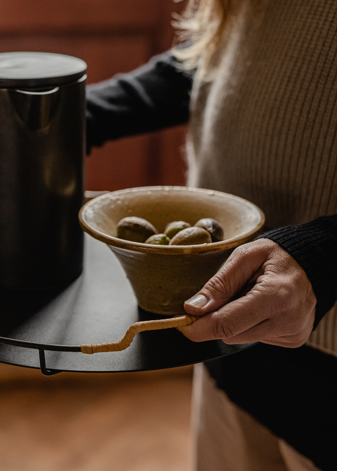 “Met het balkondienblad wordt het bedienen van gasten een plezierige ervaring. Gemaakt van strak staal, verzacht met rotan voor een handgemaakte afwerking en een stevige maar comfortabele grip. Hij beweegt gemakkelijk van oppervlak naar oppervlak en van kamer naar kamer om op elegante wijze de vruchten van je werk in de keuken tentoon te stellen. Het dienblad past perfect bij onze collectie serviesbenodigdheden en roept een gevoel van nostalgie op met zijn moderne esthetiek uit het midden van de eeuw, die de tradities van samenzijn opnieuw uitbeeldt. “