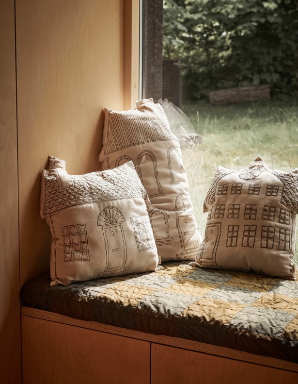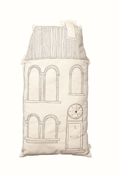 Zachte lijntekeningen zijn elegant geborduurd op het Abode-kussen en illustreren een charmant huis. Met een kussenhoes van biologisch katoen en een vulling van gerecycled polyester kan het kussen op zichzelf worden gebruikt of worden gecombineerd met andere Abode-kussens om een uitnodigend straatbeeld te creëren. Gebruik ze op een bank of versier het bed in de kamer van je kleintje voor een vleugje tastbare gezelligheid.