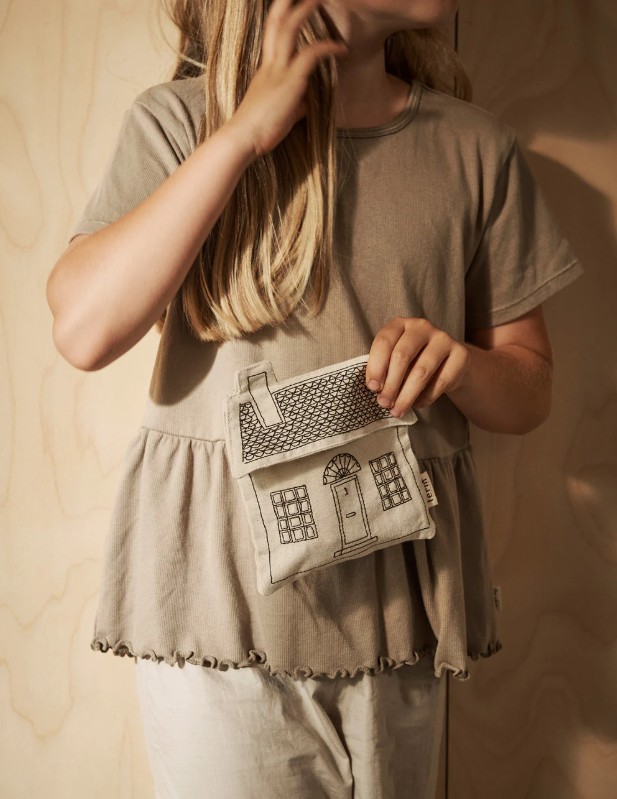 Het Abode-tasje is gemaakt van GOTS-gecertificeerd biologisch katoen en bevat elegante geborduurde lijntekeningen die een charmant huis laten zien. Het tasje heeft een handige riem en kan worden gebruikt om kleine schatten zoals een mobiele telefoon of een klein boek in te vervoeren.