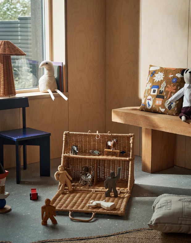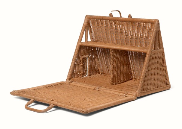 Interessant voor de jongste architectuurfans: het gevlochten A-huis is gebaseerd op de kenmerken van een archetype A-huis. Het huis is gemaakt van gevlochten rotan en functioneert als een klein poppenhuis met een deur die naar binnen leidt en kamertjes om te versieren. In gesloten toestand kan het gevlochten huis worden gedragen als een tas waarmee je kleintje zijn speelgoed van het ene sprookjesavontuur naar het andere kan vervoeren.