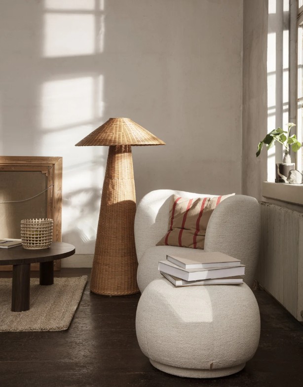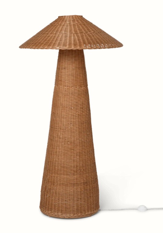 Onze Dou-serie is handgevlochten van natuurlijk rotan en benadrukt het mooie contrast tussen geometrische vormen en de organische, texturale kwaliteiten van het materiaal. Deze vloerlamp heeft oversized afmetingen en een zacht, comfortabel licht, terwijl de kap een kleine glimp van licht doorlaat door het gevlochten rotan en textuur en tactiliteit toevoegt aan je leefruimte.
