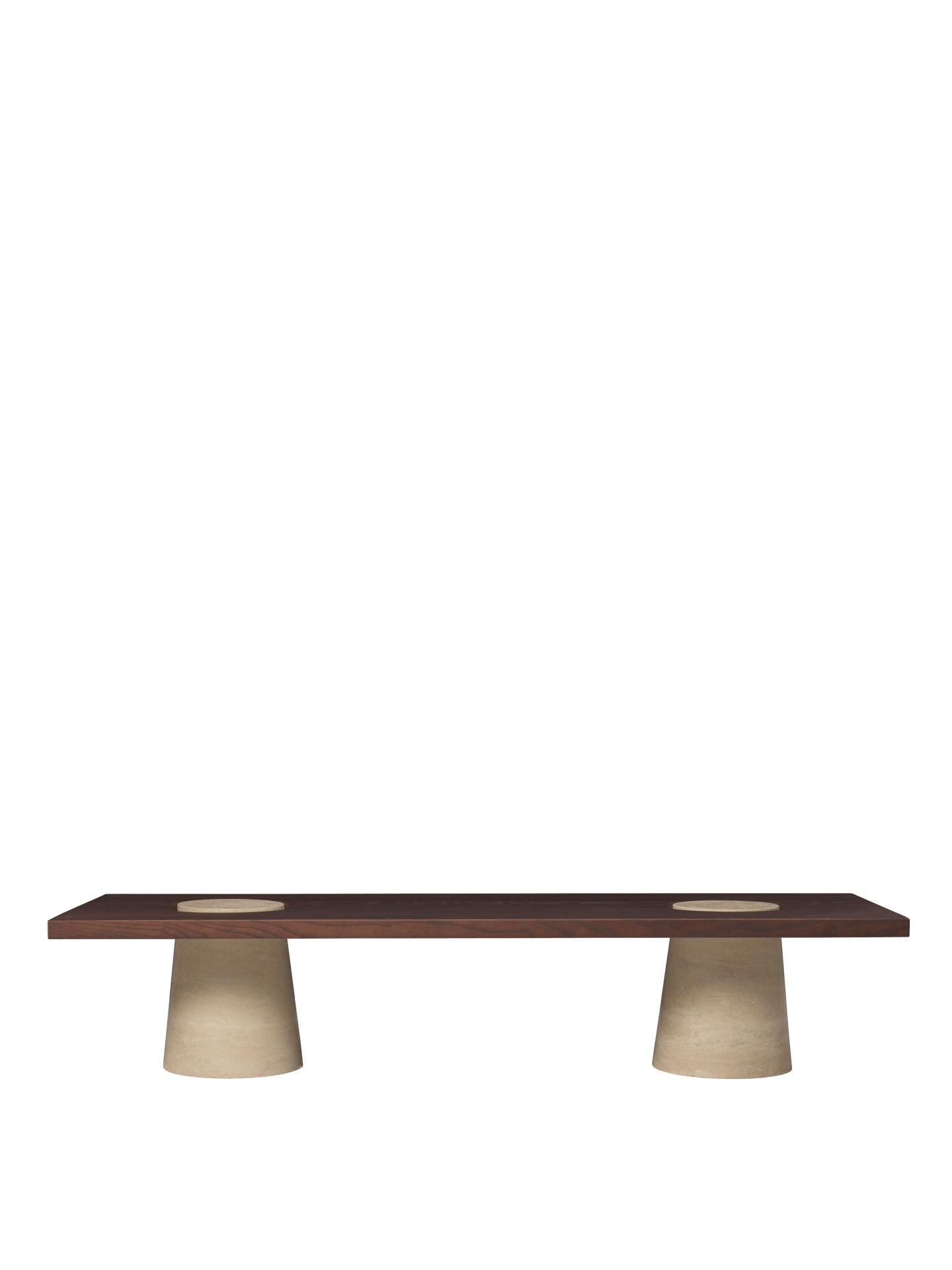 Gemaakt van FSC™-gecertificeerd hout met travertijnen poten, biedt de Grova salontafel een opvallende, sculpturale uitstraling die zowel als tafel als kunstobject functioneert. Geïnspireerd door mangrove-ecosystemen, waar wortels door het water breken, vormt het ontwerp een studie in verfijnde materiaalcontrasten en een architectonisch silhouet.