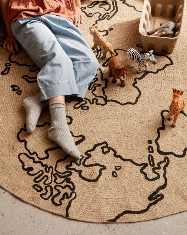 Dit ronde vloerkleed is geweven van natuurlijk jute en is versierd met een print van een wereldkaart. De natuurlijke tinten van dit duurzame materiaal zorgen ervoor dat het in elk huis past. Leg het in het midden van de slaapkamer van een kind als speelmat of naast het bed om kleine teentjes ochtends warm te houden.