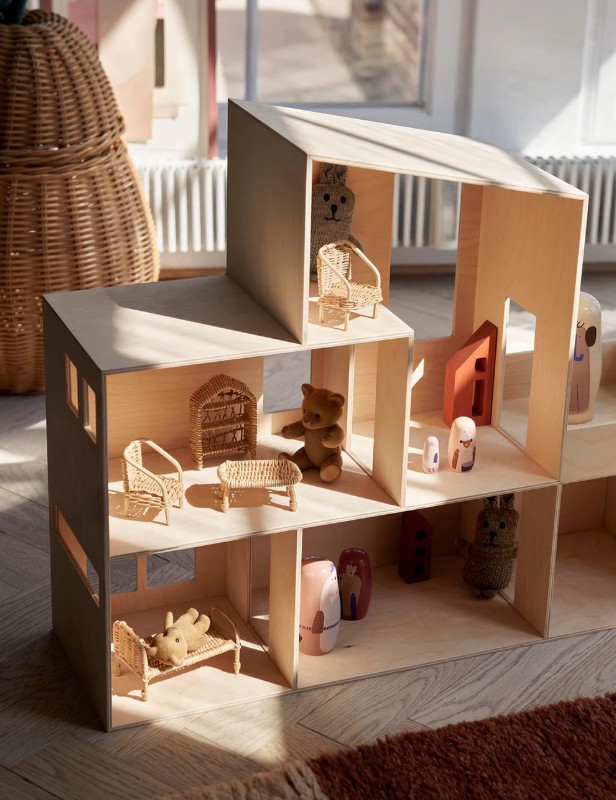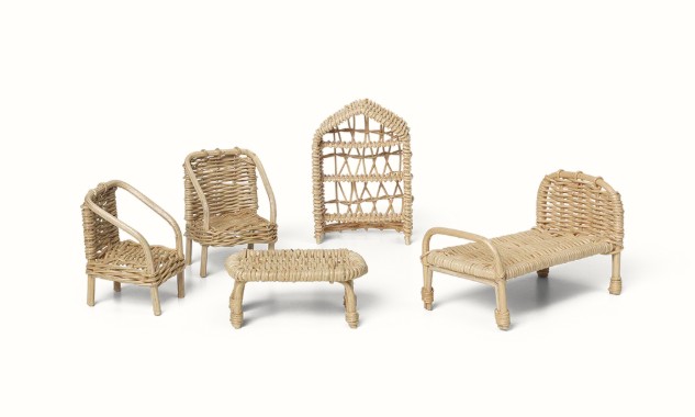 Laat je kleintje een gezellig huisje inrichten voor de favoriete poppen met deze set rotan poppenhuismeubels. De set bestaat uit een bed, tafel, twee stoelen en een boekenplank, allemaal met de hand gemaakt van natuurlijk rotan. Wordt geleverd in een klein netzakje.