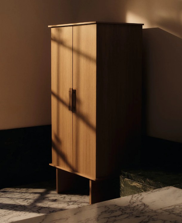 De Stilt Kledingkast combineert sculpturale elegantie met praktische opbergruimte. Hij is geïnspireerd op architecturale pilaren en heeft hoge poten en een licht, verticaal silhouet. Gemaakt van FSC® Mix-gecertificeerd eikenfineer met een duurzame kern, biedt de kast ruimte aan kleding, linnengoed of dagelijkse voorwerpen. Opvallende handgrepen en strakke lijnen maken hem ideaal voor de slaapkamer, de hal of de dressing. De kast is plat verpakt voor eenvoudige montage.