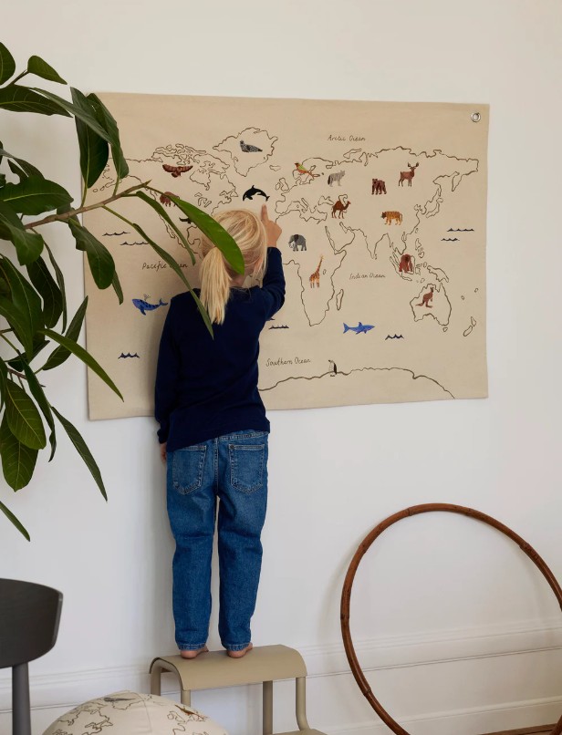 Inspireer je kleintje om meer te leren over onze verbazingwekkende planeet met de World-wereldkaart van textiel. De kaart, een tactiele, speelse wanddecoratie, toont een aantal van de prachtigste dieren van onze planeet die zorgvuldig op de stof zijn geborduurd, samen met subtiel gedrukte contouren van alle continenten. Dit zal je kind zeker helpen bij het verkennen van de dierenwereld en tegelijkertijd de World-wereldkaart van textiel voorzien van fascinerende kleuren.
