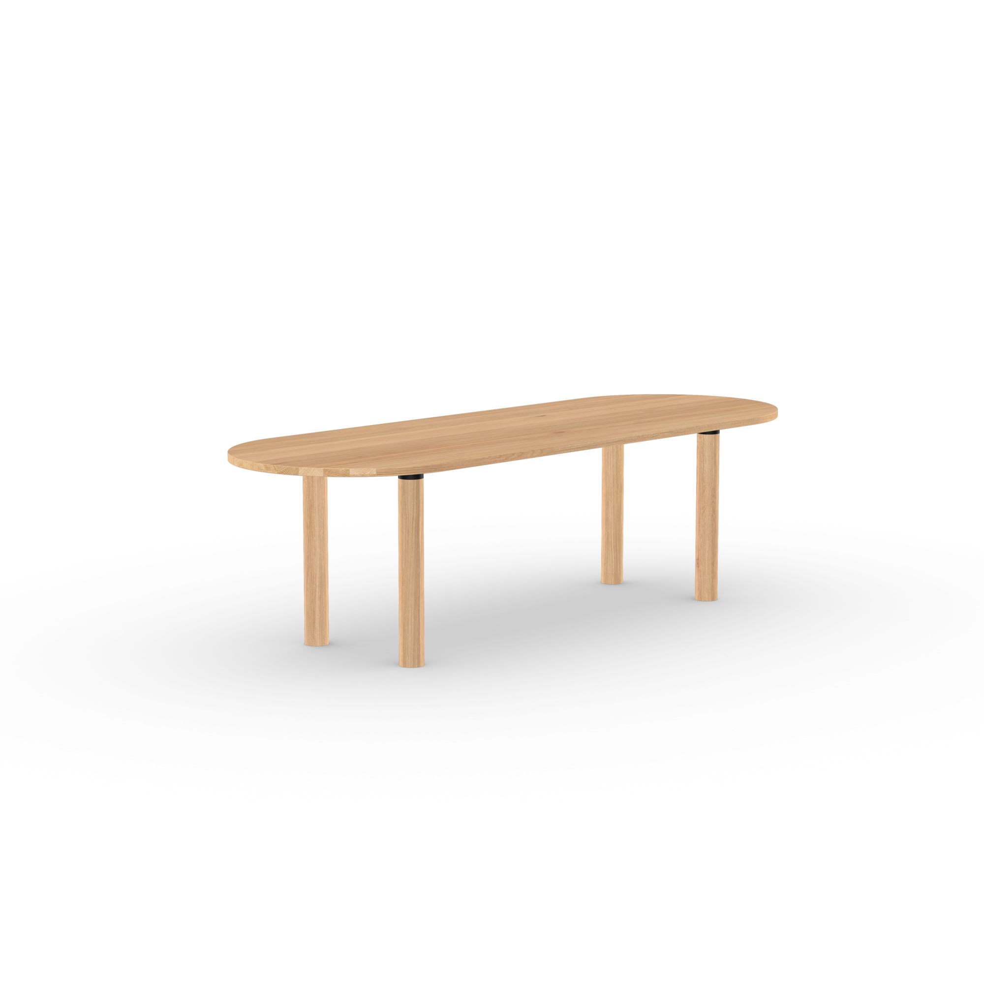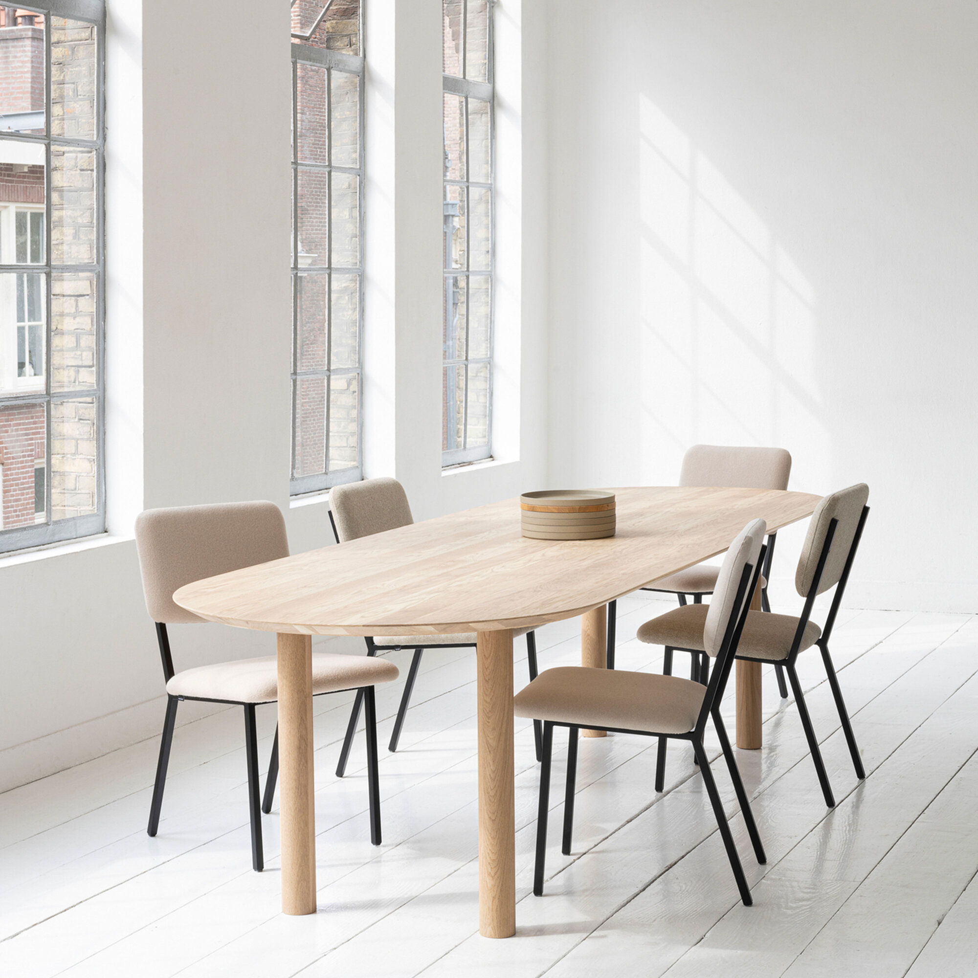 “De houten Cilindervormige poot geeft je eettafel een elegante en moderne look. Een designklassieker met een tijdloos ontwerp. Kies zelf de vorm van je tafelblad, ga je voor de de blob vorm tafelblad, een verfrissend, organisch ontwerp waarbij alles draait om het aanpassingsvermogen. Of kies je voor een (plat) ovale vorm? Uiteraard is deze tafel ook verkrijgbaar in een rechthoekige of paper vorm. Welke uitvoering je ook kiest en waar je de tafel ook plaatst, één ding is zeker; eettafel is hoe dan ook een eyecatcher in je interieur. Tafelblad kan worden uitgevoerd in verschillende kleuren eiken- of notenhout Ook verkrijgbaar met een tafelblad uitgevoerd in HPL afwerking De houten tafelframes worden uitgevoerd in verschillende kleuren eiken- of notenhout”