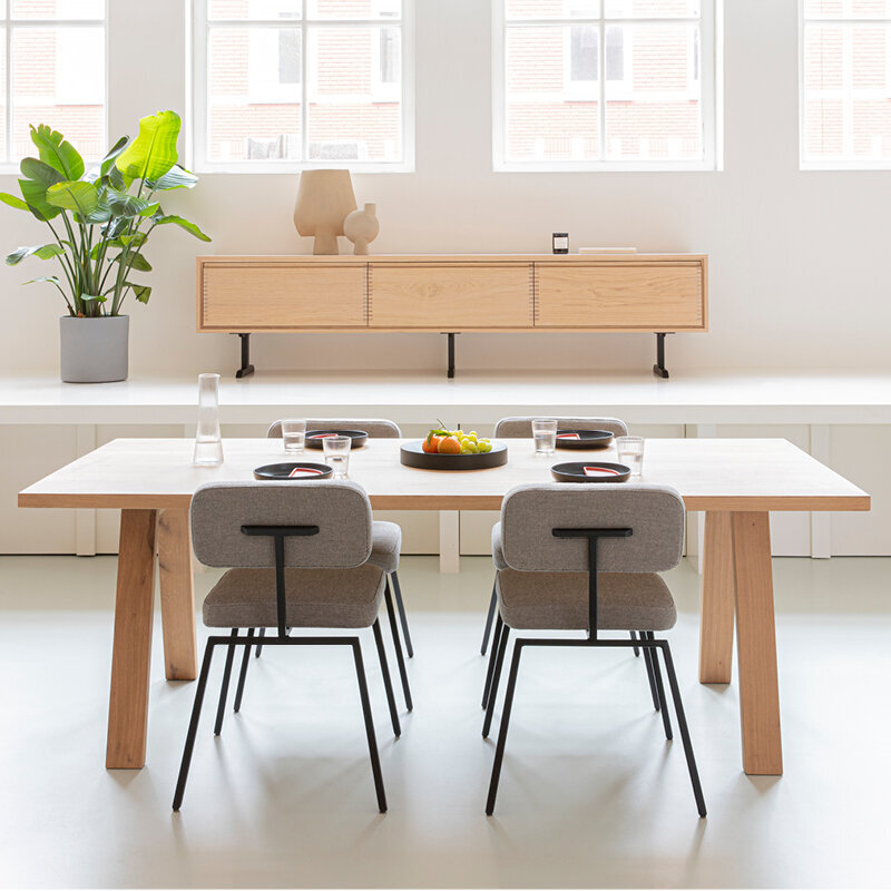 “Naast een collectie designtafels met een stalen frame maakten Studio HENK’s ontwerpers het houten Legno frame. Waar de vorm van het frame de Legno een eigentijdse uitstraling geeft, maakt het eikenhout de Legno tot een tijdloos design. Combineer het onderstel met een eikenhouten tafelblad voor een natuurlijke look, of ga voor HPL. Het warme eikenhout kan moeiteloos gecombineerd worden met de kleuren van de HPL tafelbladen. A-kwaliteit eikenhout met een hardwax olie of een twee componenten lak of HPL Het blad en frame worden gecoat met hardwax olie of twee componenten lak De tafels zijn verkrijgbaar met standaard of verjongde randafwerking Aan de onderkant van het tafelblad worden ter versterking in de breedte staalprofielen geplaatst. Bij een tafelblad groter dan 240 cm worden er ook profielen in de lengte geplaatst.”