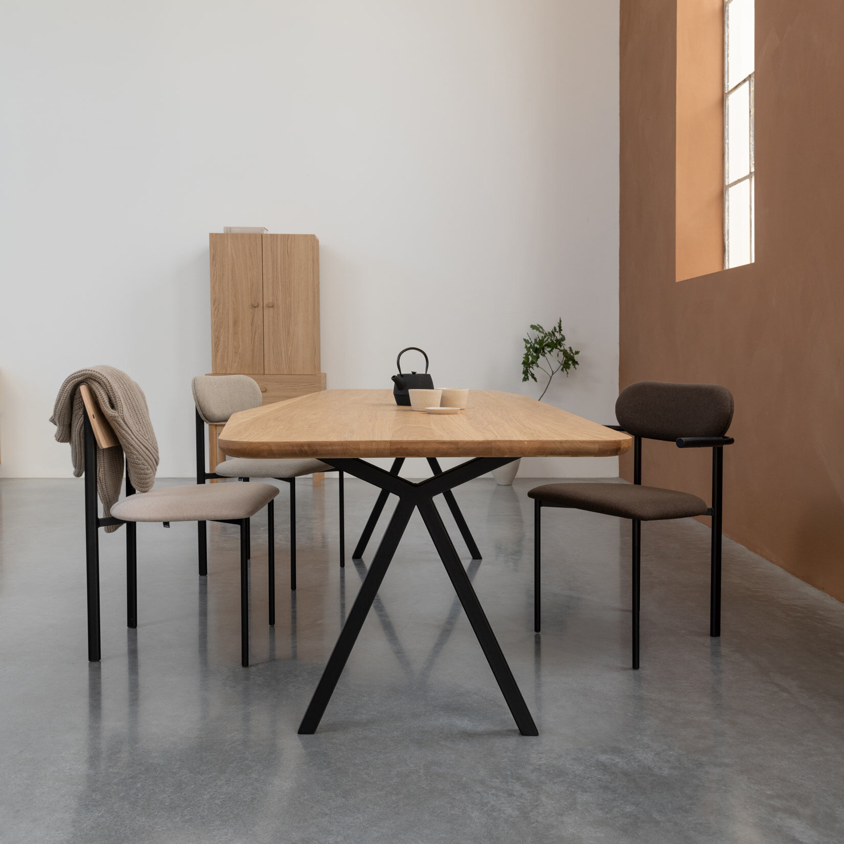 “Geïnspireerd door grafische lijnen maakten Studio HENK’s ontwerpers de Slim X-type. De Slim X-type is een uniek, geometrisch frame dat karakter aan je interieur geeft. A-kwaliteit eikenhout met een hardwax olie of een two-componentenlak of HPL Stalen frame 4×4 cm met poedercoating wit of zwart De tafels zijn verkrijgbaar met standaard of verjongde (i.e. afgeschuinde) randafwerking Aan de onderkant van het tafelblad worden ter versterking in de breedte staalprofielen geplaatst. Bij een tafelblad groter dan 240 cm worden er ook profielen in de lengte geplaatst.”