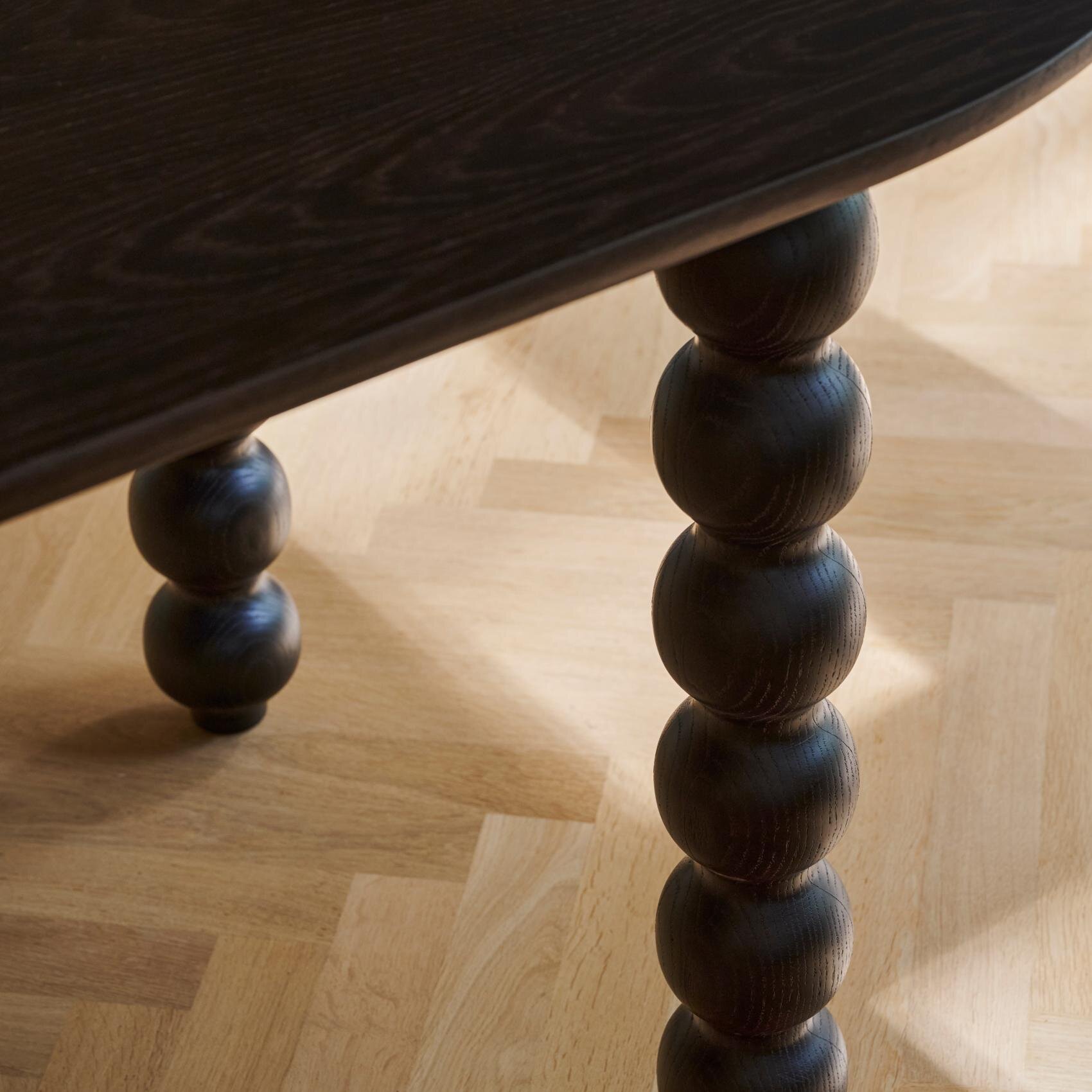 “De elegante bolpoten van de Turn tafel zijn gemaakt van massief hout en brengen karakter in elke eetkamer. Een tijdloos meubelstuk dat historisch vakmanschap en hedendaags design combineert. De Turn tafel ontleent zijn decoratieve vormentaal aan de gedurfde rondingen en uitbundige versieringen die we kennen van 17e-eeuwse meubels. Door het ontwerp biedt de Turn tafel veel beenruimte. FSC gecertificeerd eiken- of notenhout Afgewerkt met lak of hardwax olie Land van herkomst: Roemenië (eikenhout) of Nederland (notenhout) “