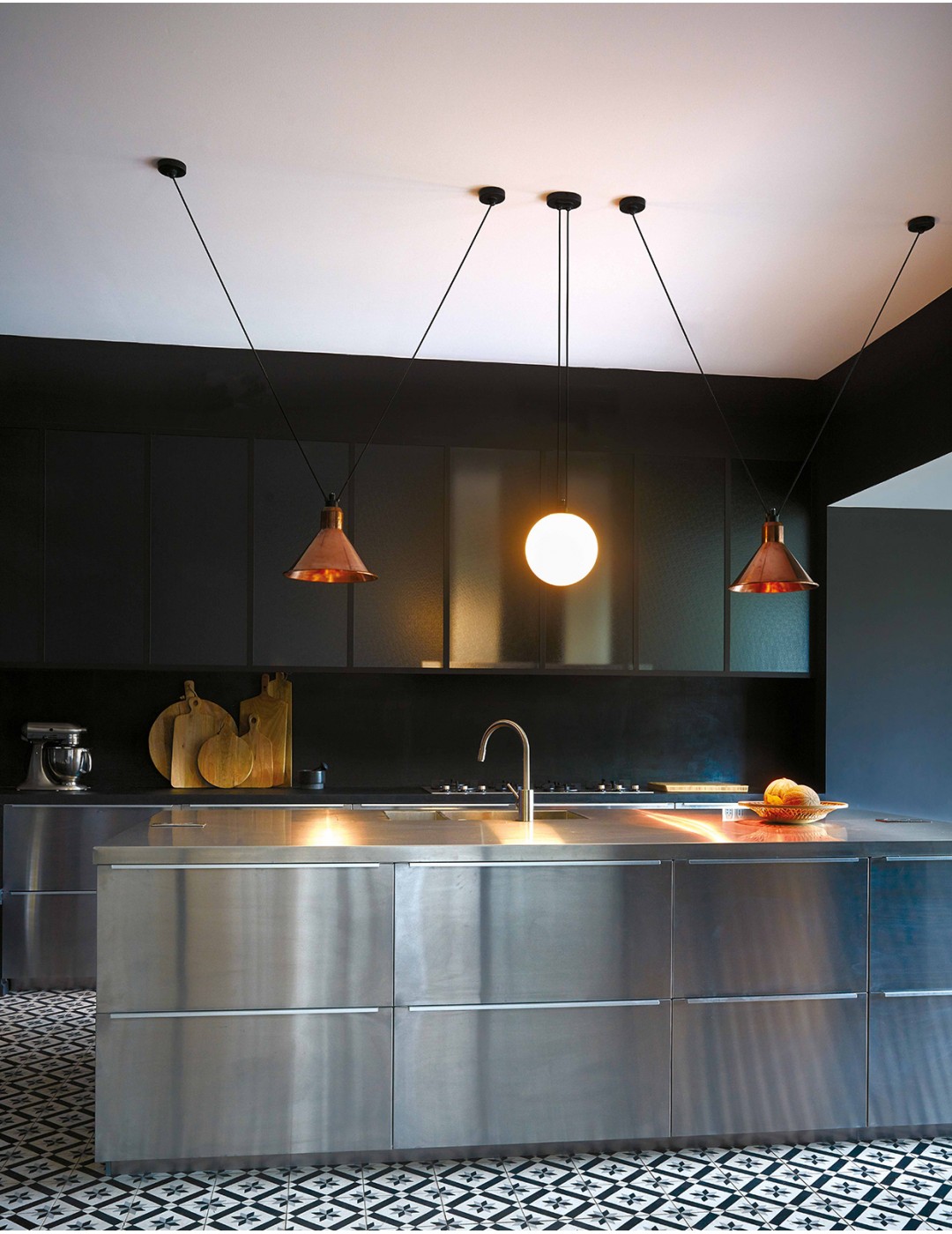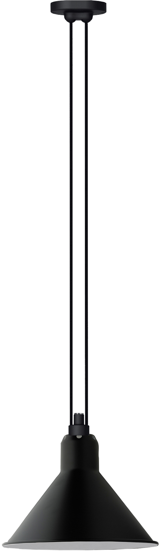 Les Acrobates de Gras is a pendant lamp with one or more lampshades suspended between diagonal textile cables, which creates a dynamic look. The lamps were designed by Bernard-Albin Gras and launched in 2015 by DCW éditions. The lampshades are available in different finishes. The textile cables are adjustable and each have their own and a common ceiling bracket in matt black aluminium. Light source not included. Les Acrobates de Gras can be used alone, in groups, or in combination with other models from the same series. Install the lamp above the dining table or perhaps in a playful child's room, as this lamp is playfully inspired by acrobats swinging through the air in a circus.