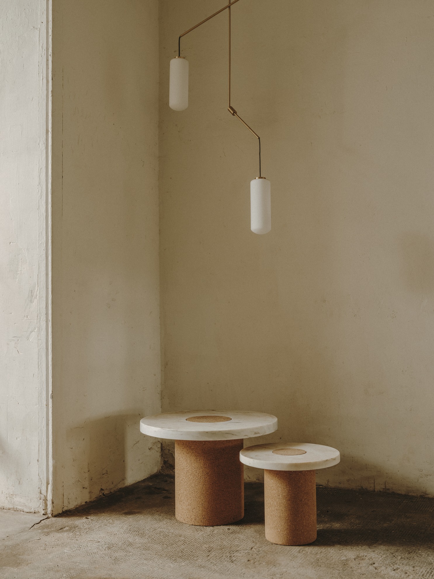 Suitable as a coffee table or side table, the Sintra Table features a smooth marble top with a contrasting rounded cork base. The polished surface of the marble showcases the intricate veins and natural beauty of the stone, while the cork base offers unique lightweight and durable properties - a sculptural piece of furniture with expressive properties and functionality.