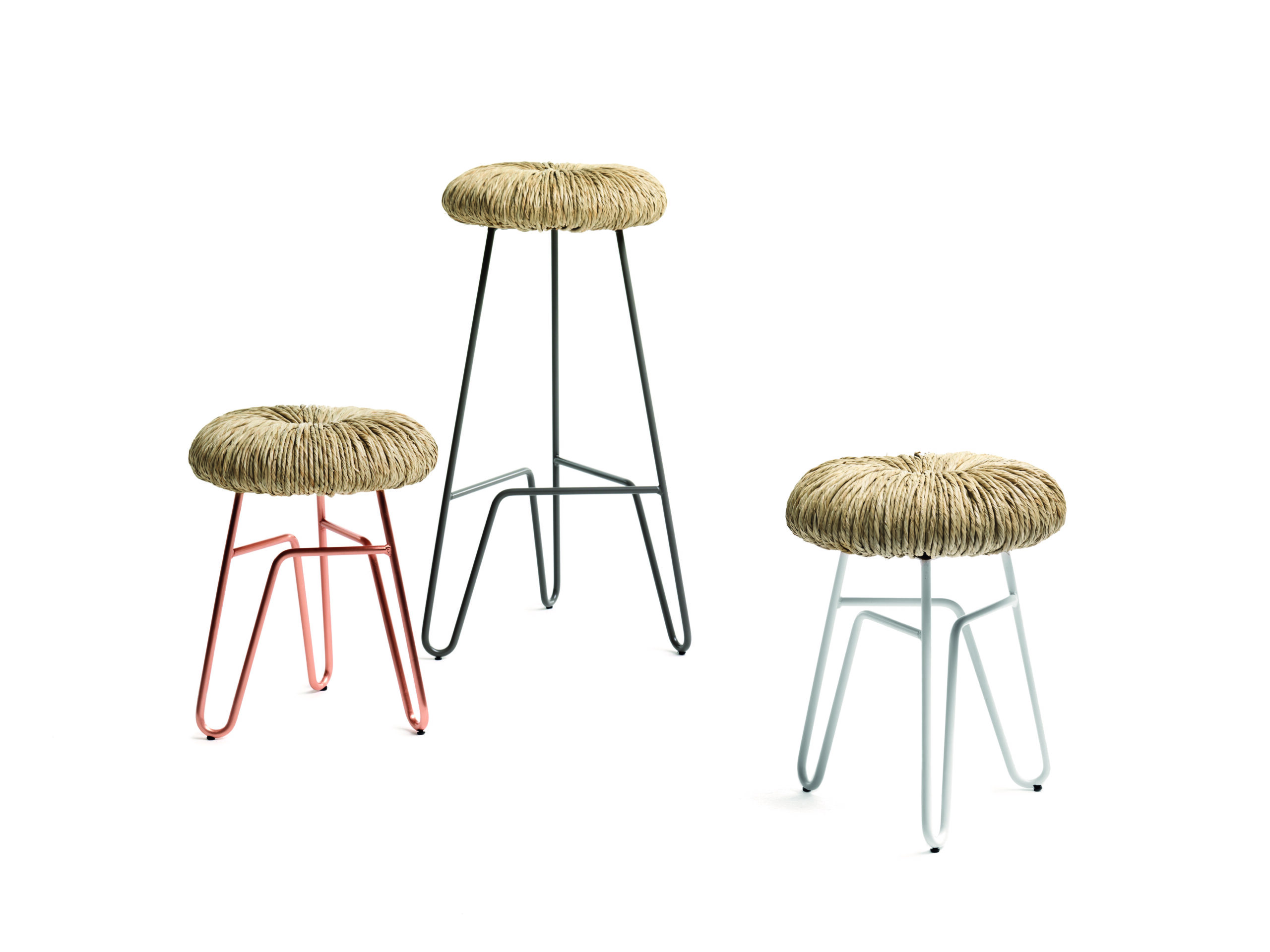 The Mogg Donut Stool is a striking bar stool and ottoman that combines comfort and style. This stool is upholstered in beautiful straw, woven over a rolled, padded base for a comfortable seating experience. The sturdy metal structure ensures stability and durability, while the natural material of the straw gives a playful and organic look.
