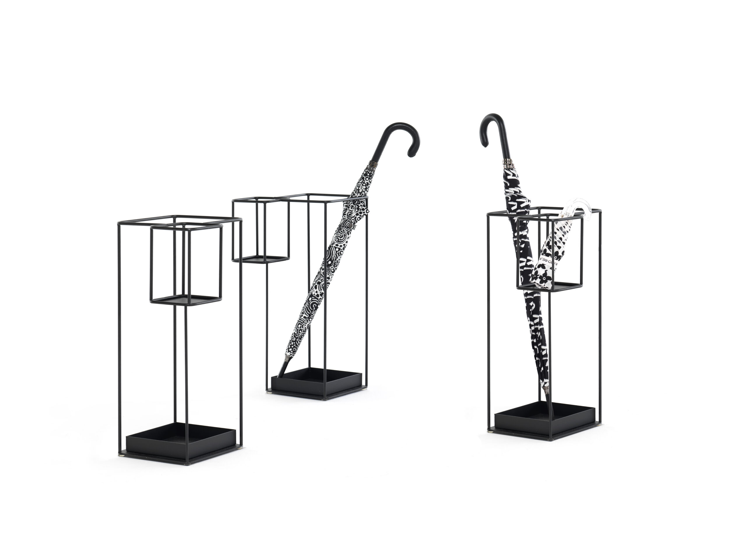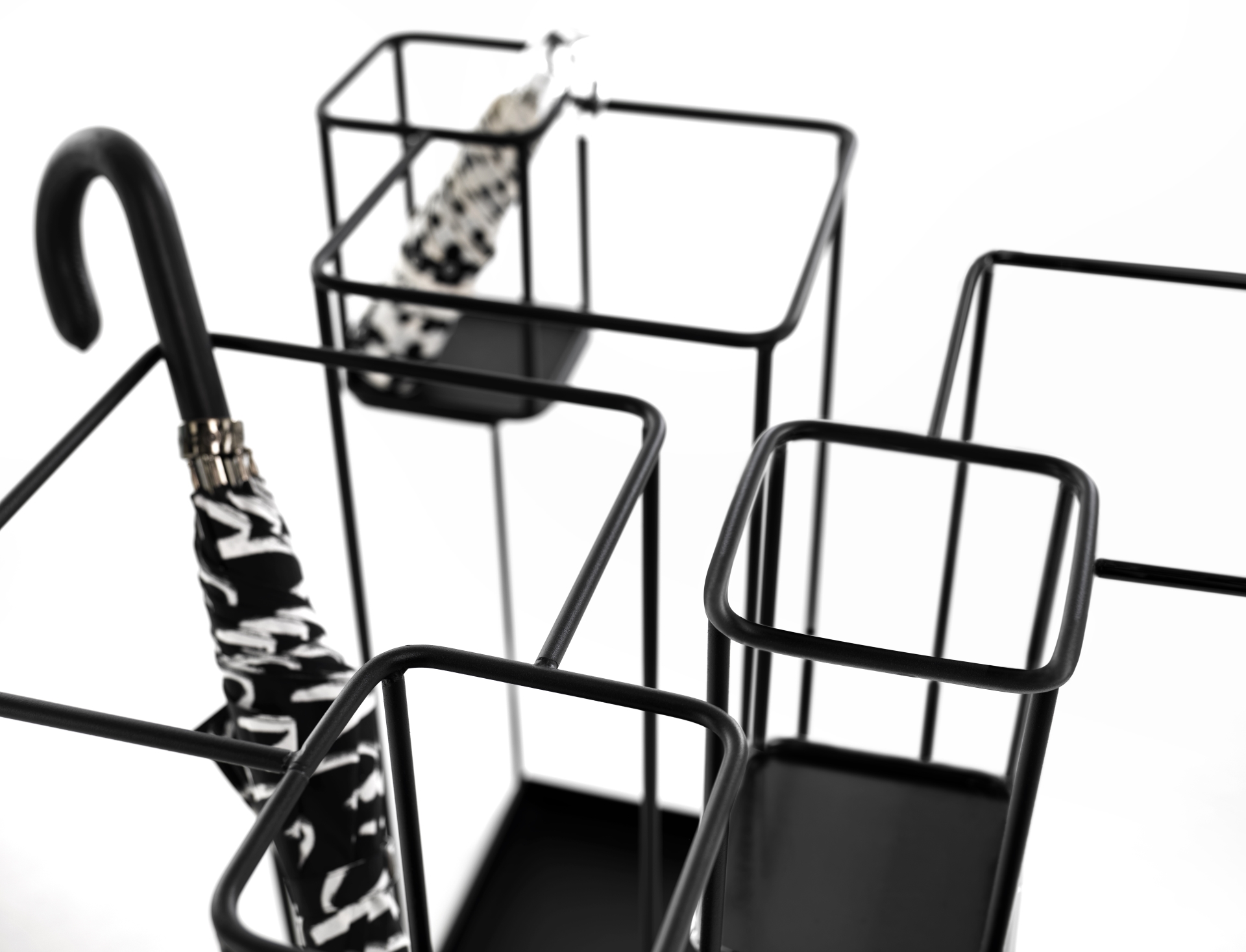 The Duo umbrella stand is a stylish hallway accessory made of black painted metal. This umbrella stand is designed to neatly store both small and large umbrellas, keeping your hallway tidy at all times. With its sleek, modern look, the Duo umbrella stand adds a touch of elegance and functionality to any entrance. Perfect for those who love practical and beautiful solutions in their home.