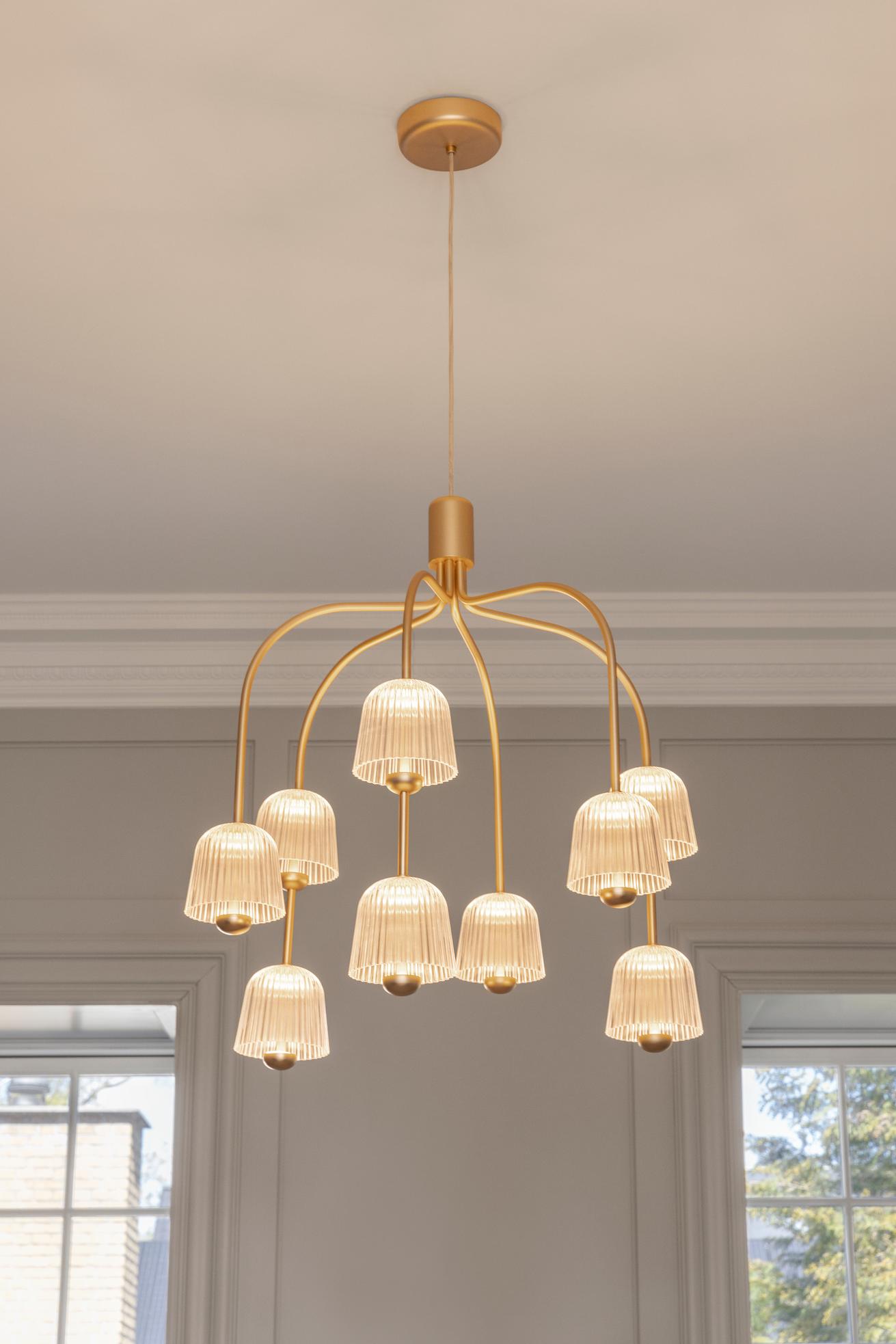 De kroonluchter Asteea 9 uit de collectie valt op door zijn innovatieve constructie, waarbij twee lichtbronnen op één arm zijn gemonteerd, wat de lamp een lichte en modulaire uitstraling geeft. Deze geavanceerde techniek maakt meerdere lichtbronnen op één arm mogelijk en straalt indirect licht uit dat de kamer verlicht zonder te verblinden. Het licht wordt weerkaatst in de gegroefde acrylkappen, wat zorgt voor een subtiel, levendig lichtspel.