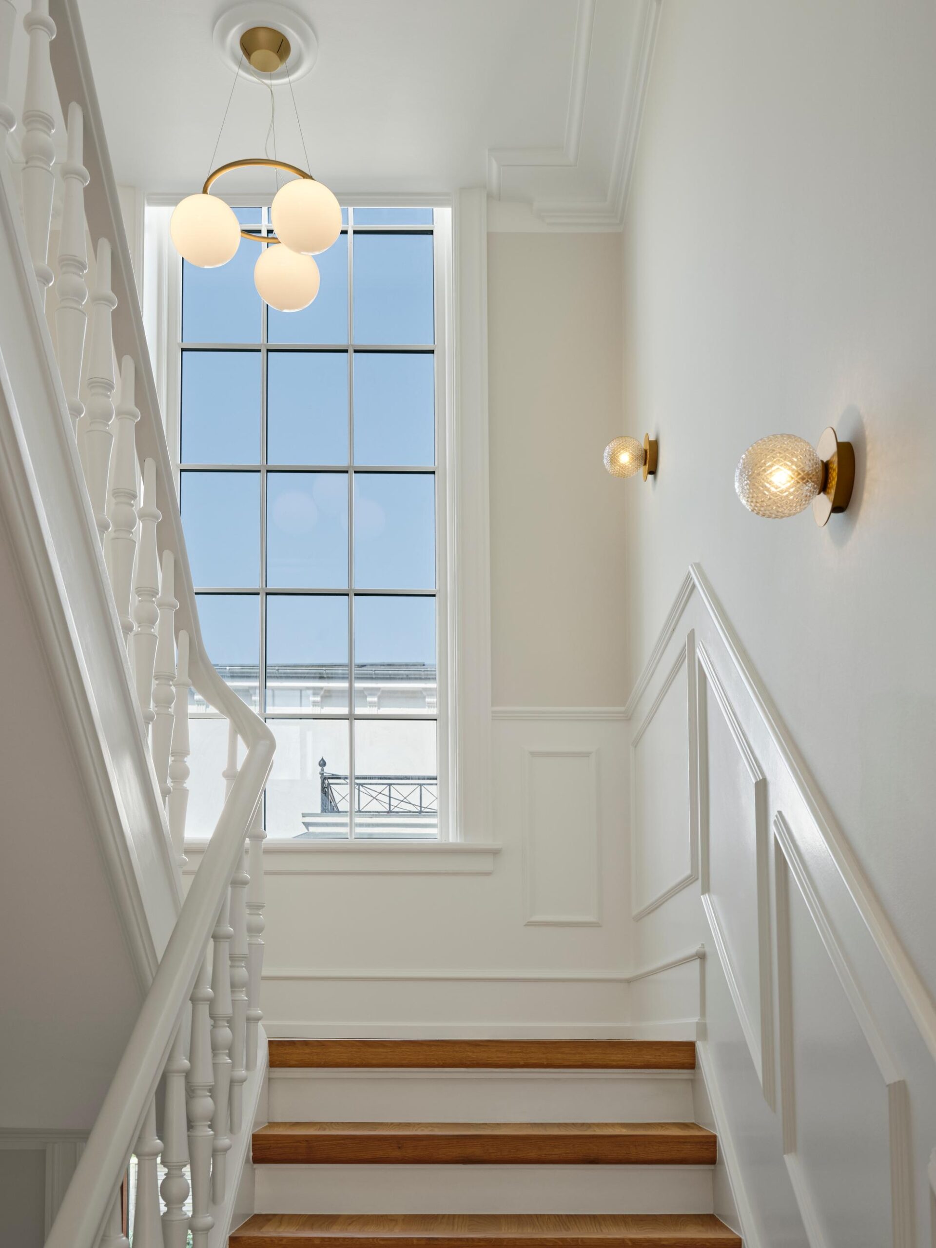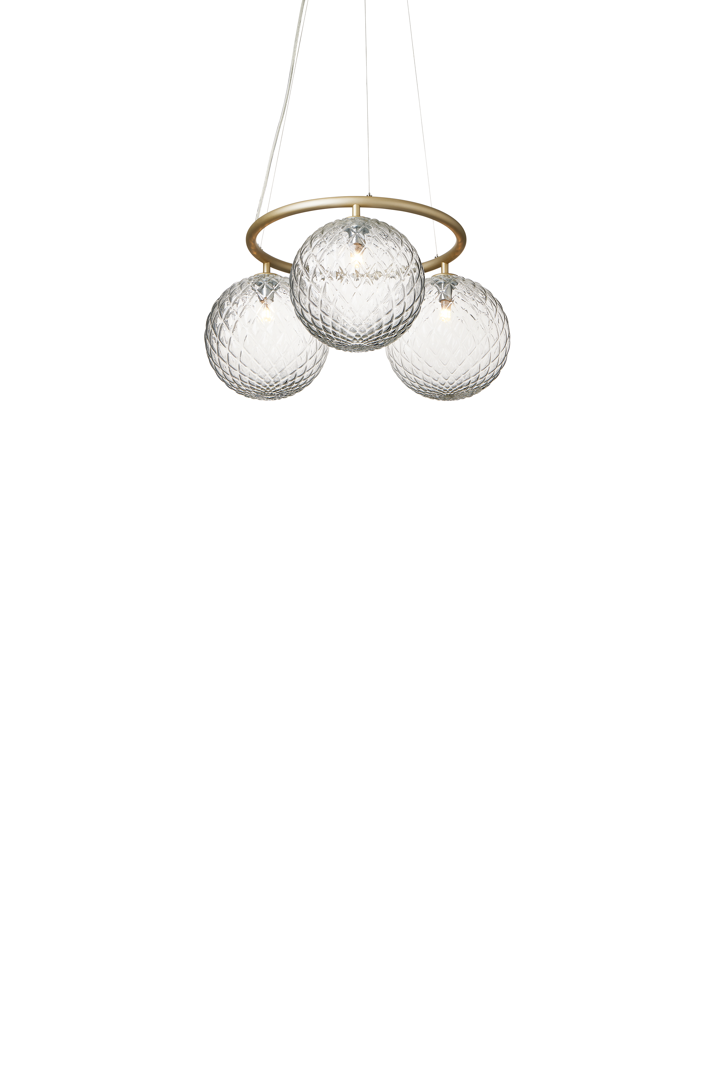 Miira 3 Circular is a modern chandelier with a Scandinavian and minimalist design. A smooth halo metal ring is neatly powder coated in a golden brass finish and contains 3 large mouth-blown glass balls in opal white glass, spreading a soft and diffused light to the immediate surroundings. The small chandelier is suitable as a central light in a smaller living room or as two chandeliers above an elongated dining table, where the sleek design makes Miira 3 Circular an atmospheric yet practical lighting choice. Including ceiling plate.