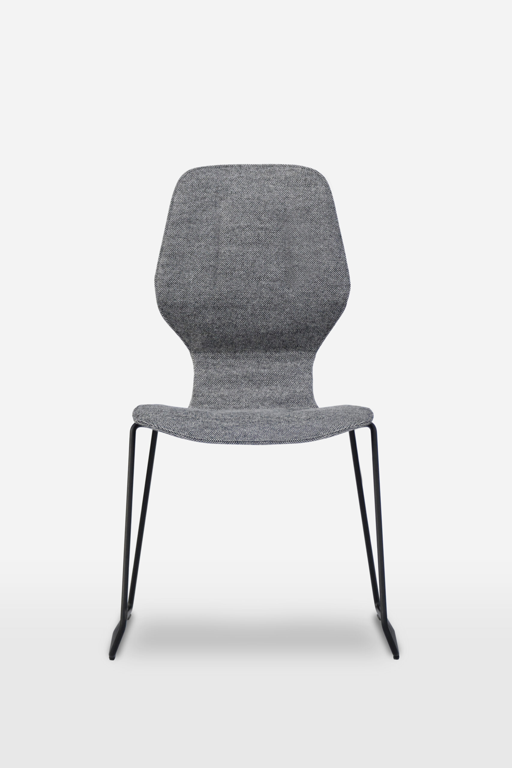 Deze afleiding van de Oblique-familie behoudt, ongeacht het verschil in technologie en typologie met zijn gestoffeerde broers en zussen, het karakteristieke S-vormige profiel van de stoel. De sterke kromming van de schaal zorgt voor een goede ergonomie, wat verder wordt benadrukt door de elasticiteit die uit deze geometrie wordt verkregen. De schaal is gemaakt van 2D gevormd multiplex, gecombineerd met 6 versies stalen poten waarvan 4 stapelbaar, en een massief houten onderstel.