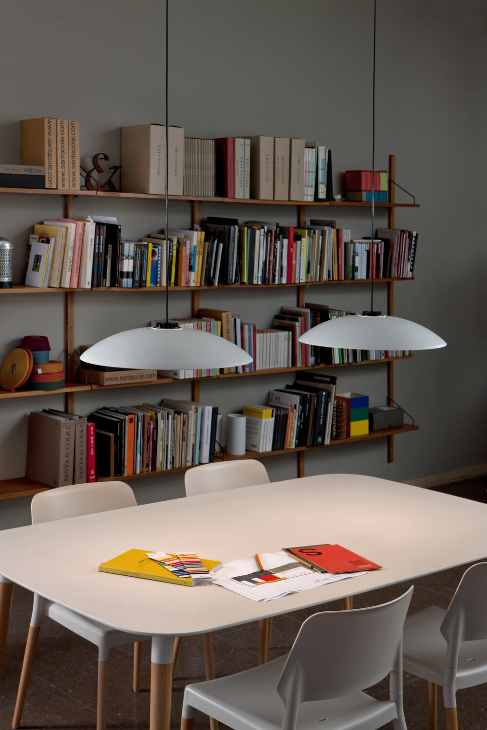 Bij Santa & Cole hebben we een LED-systeem ontwikkeld dat zich aanpast aan verschillende tinten, net zoals de Edison-draad dat doet. Zo kan een enkel hoofd gecombineerd worden met verschillende hoeden. De gepolijste metalen lampenkappen zorgen voor een algemene, niet-verblindende verlichting, en hoe groter de diameter, hoe meer het licht zich verspreidt.