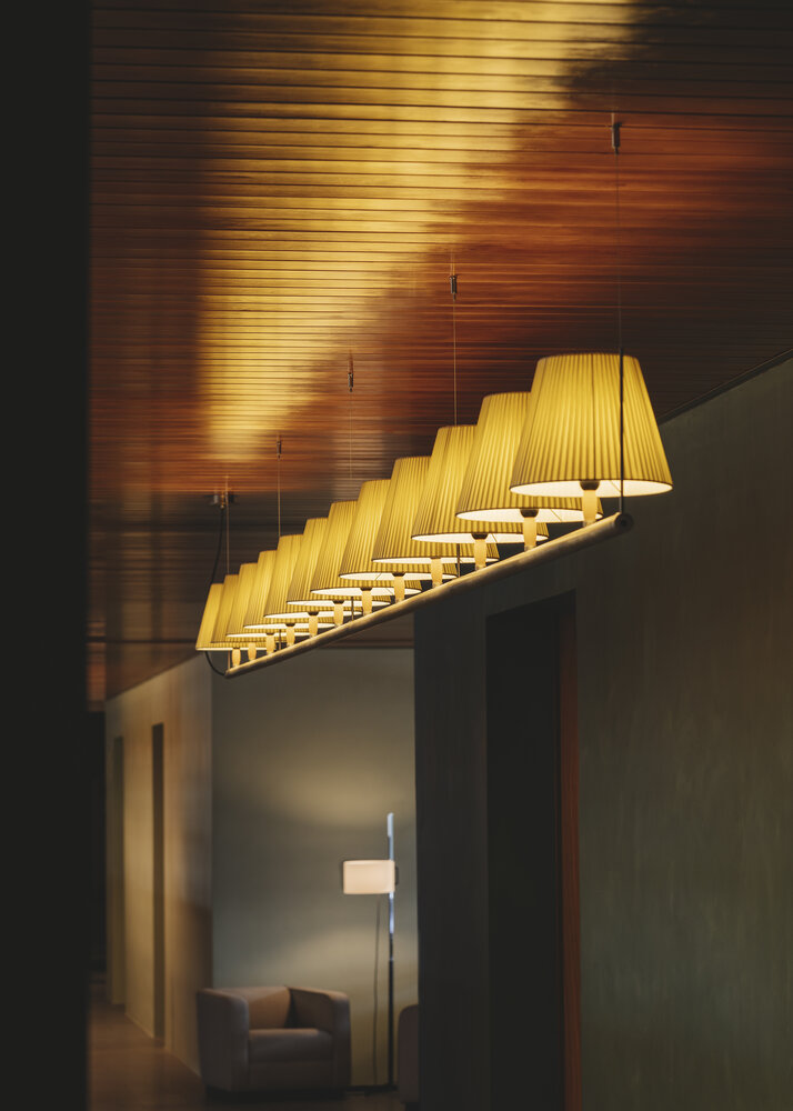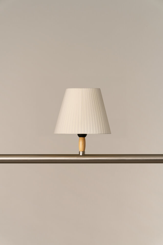 Sistema Fonda zorgt voor weelderige verlichting door een geheel moderne uitstraling. Met behulp van segmenten van één of drie lampenkappen en drie soorten verbindingsstukken daartussen wordt een compleet verlichtingssysteem opgesteld, gebaseerd op lineaire buisstructuren waarop kleine of middelgrote lampenkappen worden geplaatst, gekleed in linten, perkament of wit linnen, en ondersteund door kleine lampenkapjes. stukken natuurlijk beukenhout.