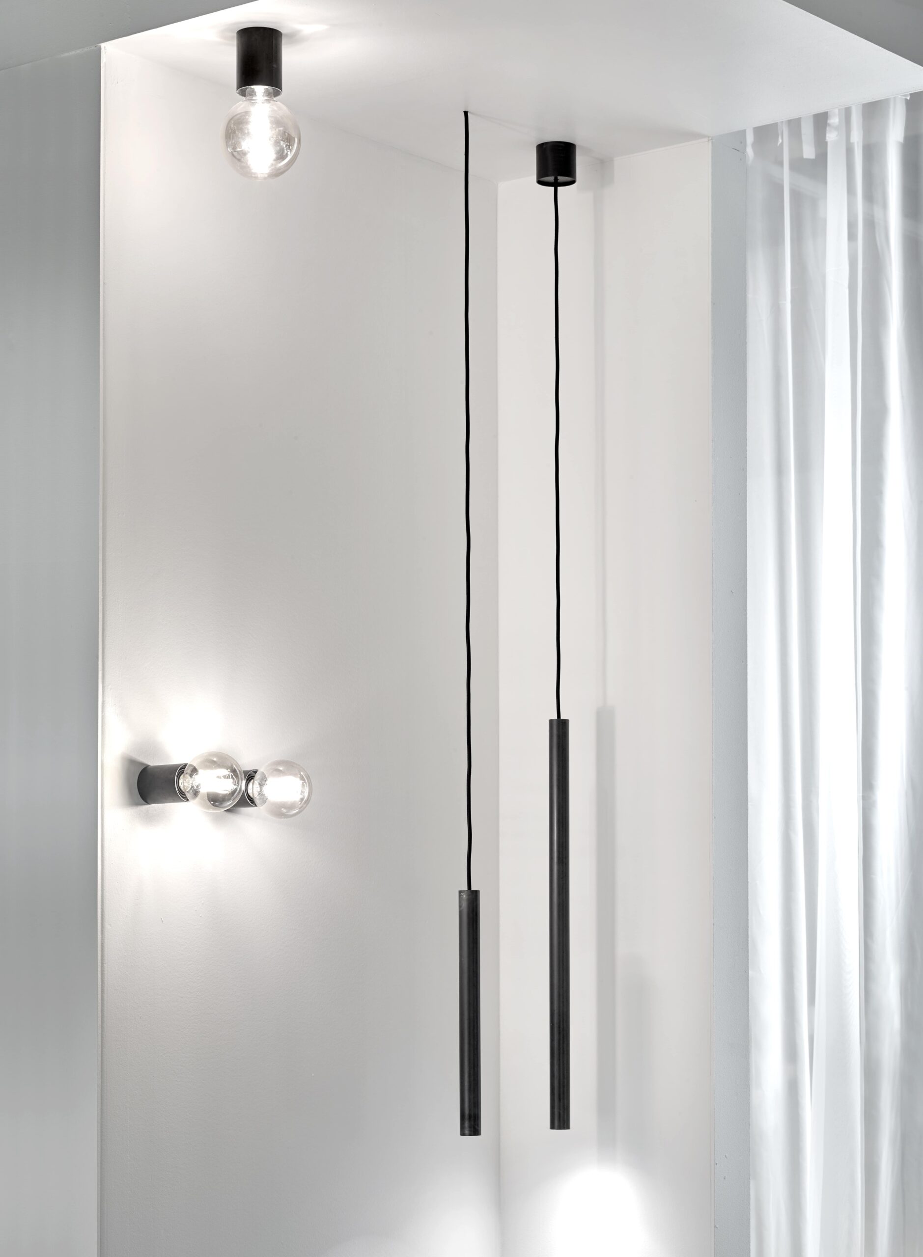 De Sofisticato Pendant 35-400- en Pendant 35-700-hangspots hebben een vaste led-module in een stalen koker met een lengte van 40 of 70 cm en een diameter van slechts 3,5 cm. Het staal is handmatig verhit en geboend voor het kenmerkende blauwe effect van de Sofisticato-lijn.