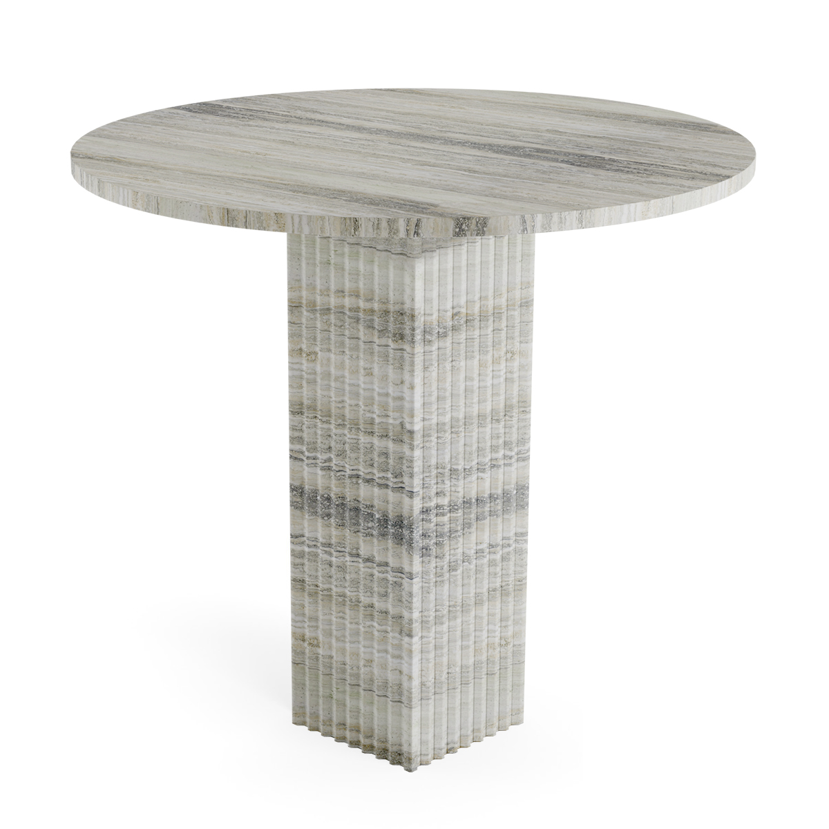 The Soho table is made of travertine and features a column and a table top designed to contrast with each other. The table top, thin and light, contrasts with the robust and fluted base of the column. A deliberate interplay between heavy and light elements makes the table interesting. The surface of the table is treated with a Nano coating to prevent light spillage, which guarantees usability without compromising aesthetics, as the surface retains its matte finish. Meanwhile, the raw and untreated column shows the purity of the material and embraces the beauty found in the small hollows and noticeable imperfections.